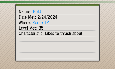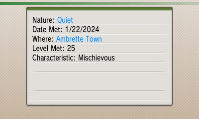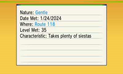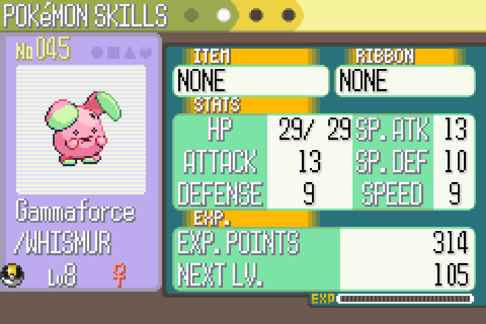 The most recent Full Odds Pokémon I've caught is this Whismur. It was caught Jan, 9th, 2024. The Screenshot was taking using GB Operator's emulator. This is also my first generation 3 shiny.