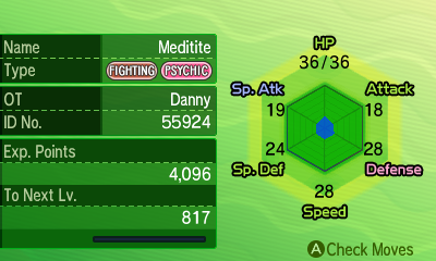 The first pokemon on this list and the very first Pokémon I caught is Meditite. Caught on Pokémon Platinum this pokémon holds a special part in my heart with it being around 15 years old.